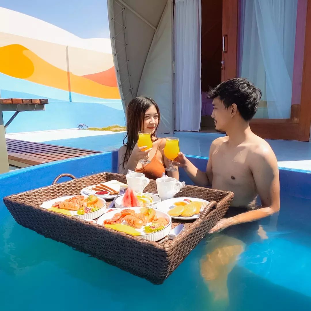 Setiap kamar yang ada di HeHa Ocean Glamping memiliki teras kecil dengan meja dan kursi untuk bersantai sambil makan atau minum. Tidak hanya itu saja, ada bak kecil yang bisa digunakan untuk berendam atau floating breakfast.