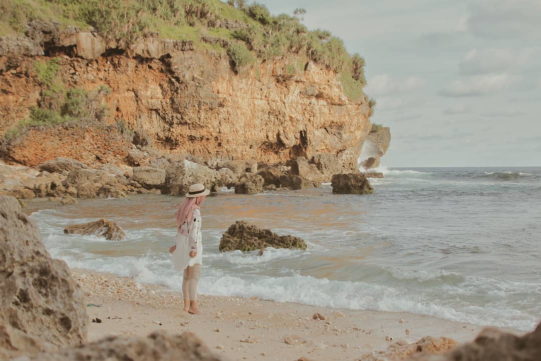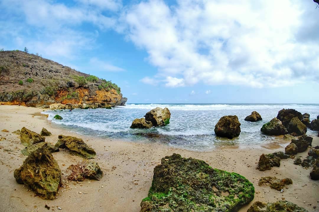 Selain letaknya sedikit tersembunyi diapit dua bukit karang dan batuan kars khas pesisir Gunungkidul, pantai ini memiliki garis pantai menyerupai teluk kecil dengan hamparan pasir putih cukup luas.