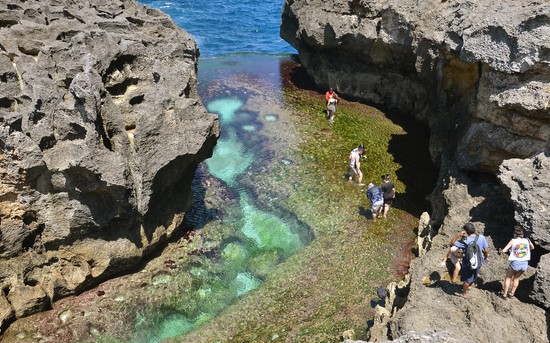 Warna kolam ini hijau kebiruan dan jernih sekali, selain itu terhimpit oleh dua batu besar yang membatasi lautan biru pekat.