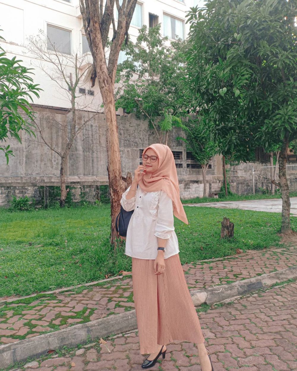 Selain pink, peach juga merupakan salah satu warna pastel yang cocok dengan putih. Perbedaan tone dari keduanya akan saling melengkapi satu sama lain dan membuat penampilanmu terlihat hidup. Untuk melengkapi penampilanmu, kalian bisa memakai bawahan peach lho. Tampilan ini akan sangat cocok dipakai saat kegiatan sehari-hari.