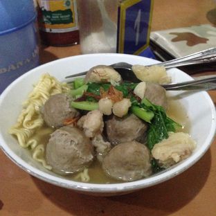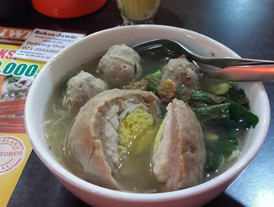 Bakso jumbo berisi potongan daging sapi cincang dan bakso polos menjadi andalan tempat ini, ditambah dengan kuah kaldu yang gurih dan disajikan beserta bawang goreng.