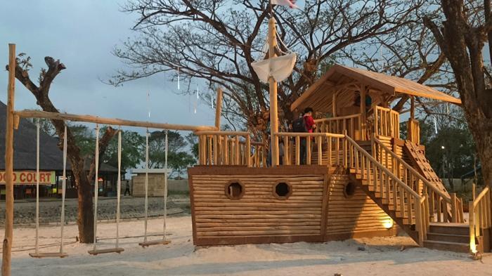 Kalau Anda membawa anak kecil, ajak mereka bermain di playground yang dilengkapi pasir putih layaknya di pantai. Atau naik ke miniatur kapal yang terbuat dari kayu melalui tangga serta jembatan rintangan.