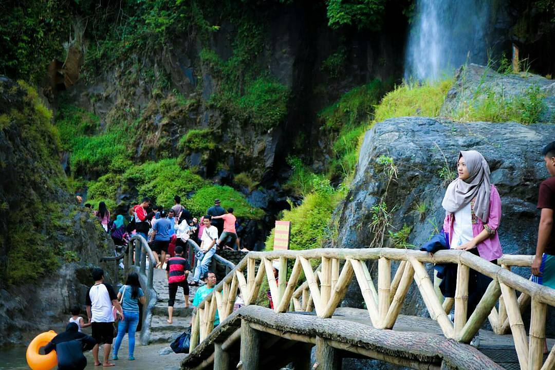 Ditengah bebatuan yang terbelah tersebut dibangun sebuah jembatan sehingga para pengunjung akan lebih mudah menapaki jalur dari luar menuju area air terjun.
