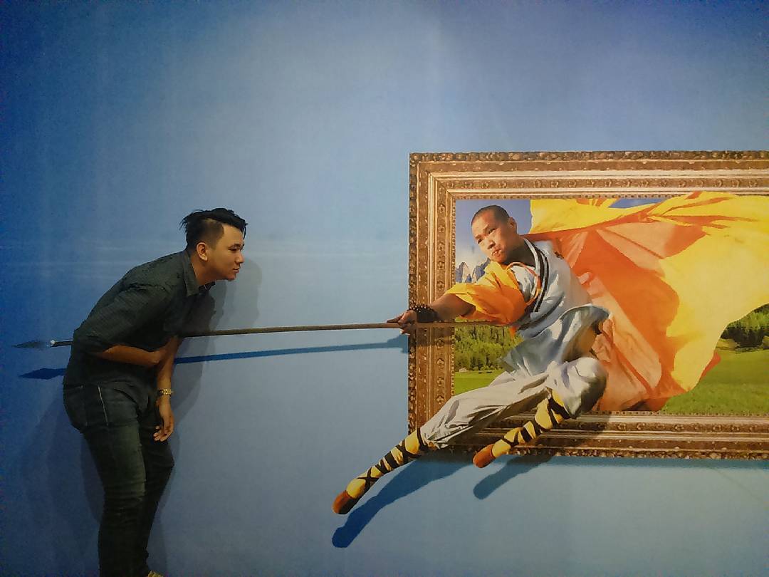 Dengan memanfaatkan lukisan 3D tersebut sebagai background foto, Anda bisa seolah-olah berada di atas Tembok Besar China, bermain dengan panda di hutan bambu, berselancar di tengah besarnya ombak laut.