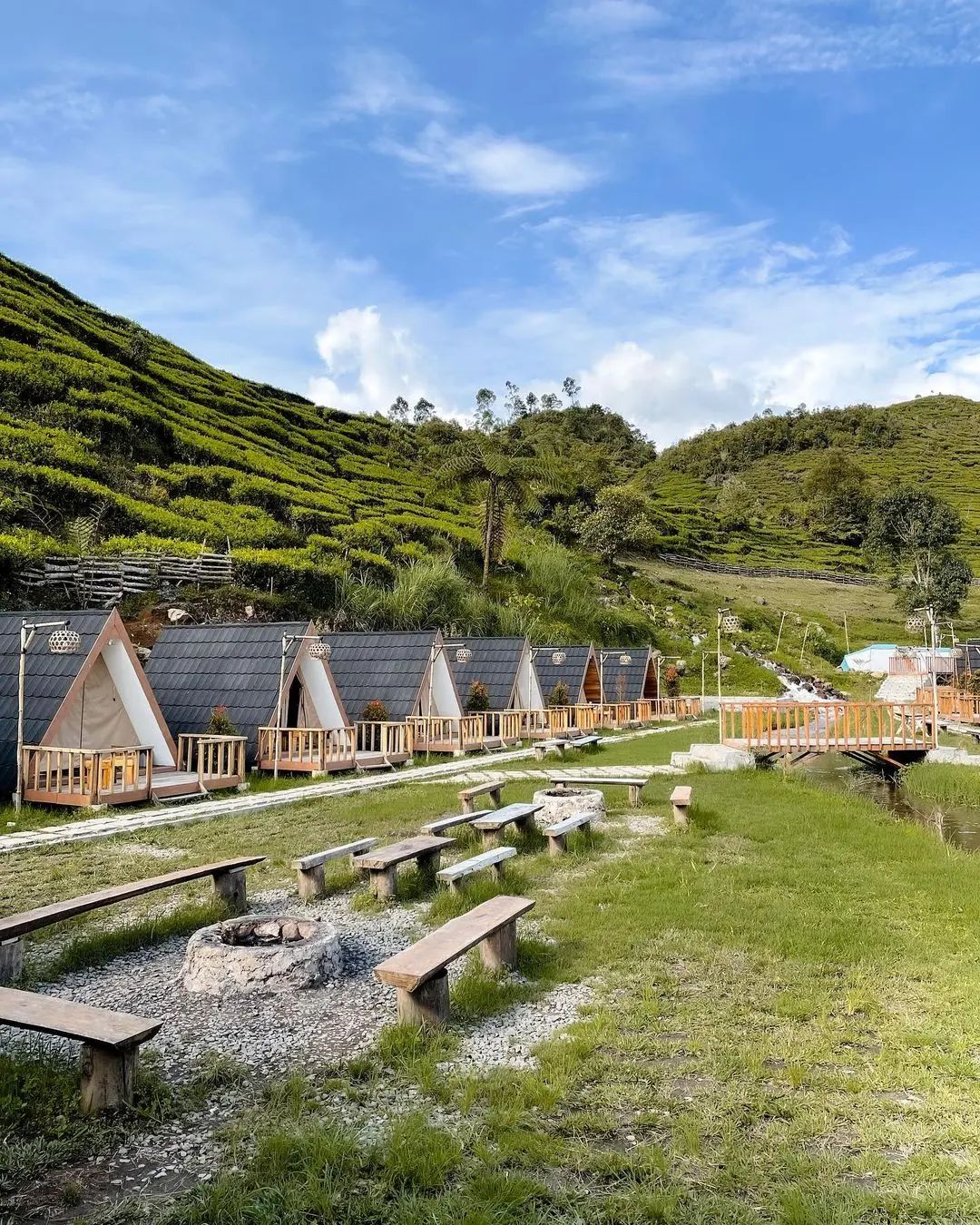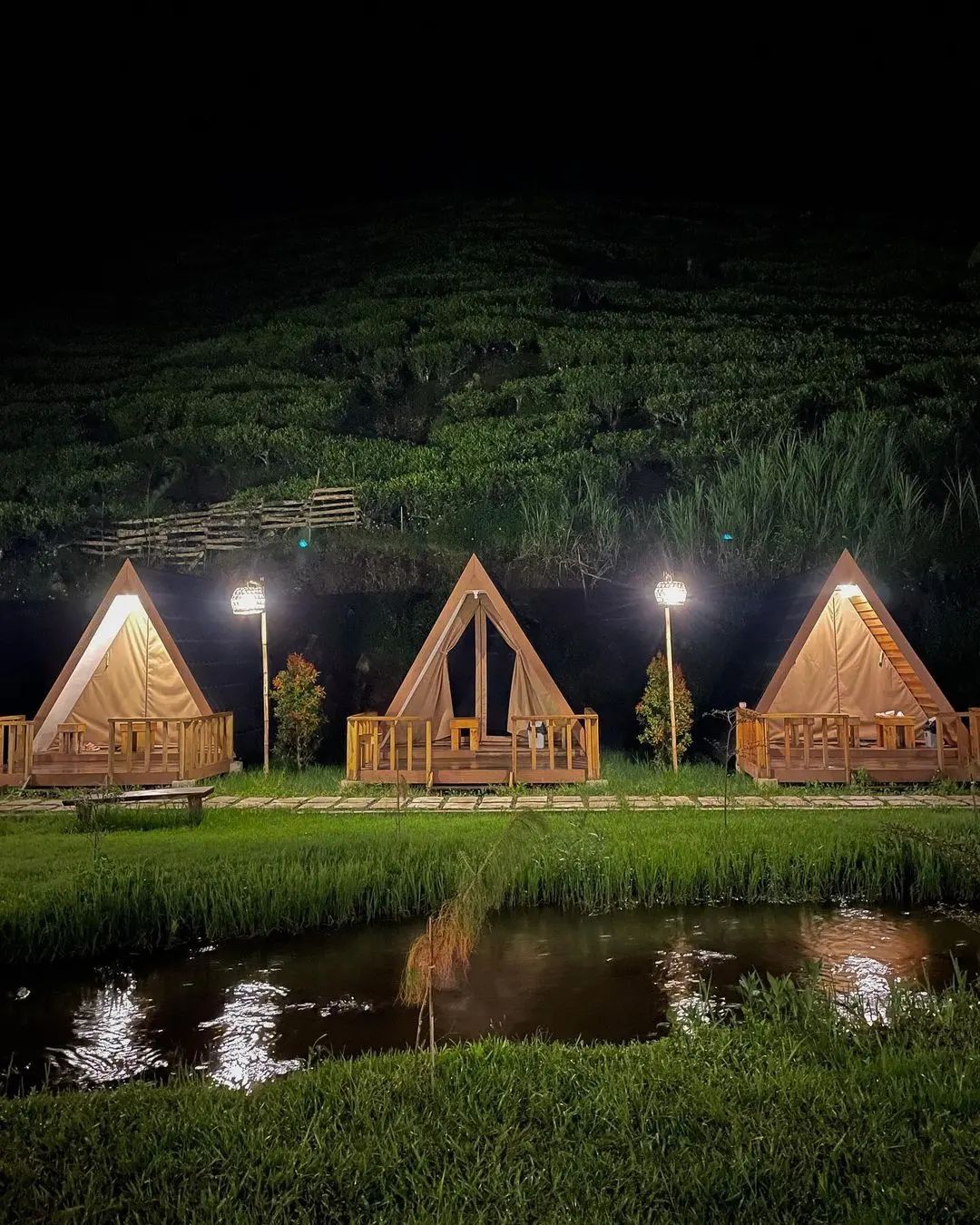 Di Ecopark Curug Tilu, kamu bisa merasakan sensasi glamping di tenda yang cukup besar dan memiliki kasur. Tempatnya dikelilingi pemandangan kebun teh yang sangat asri dan udaranya pun sejuk.