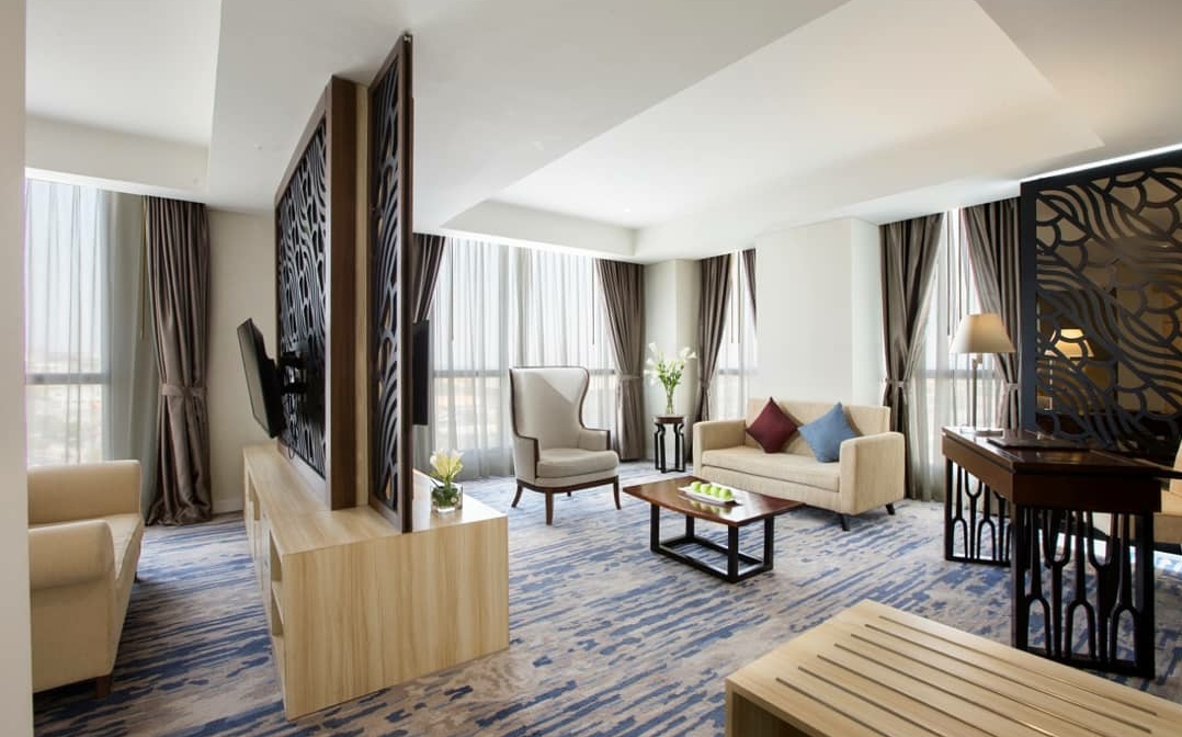 Kamar seluas 52 m² tersebut telah dilengkapi dengan ruang tamu terpisah dan juga area kerja yang siap untuk menunjang aktivitas bisnis kamu selama menginap di GranDhika Hotel.