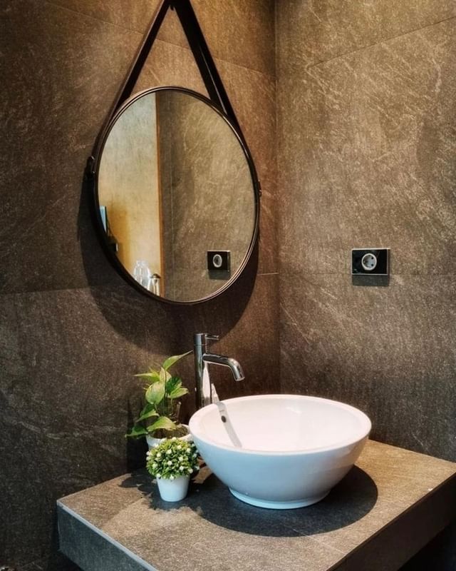 Kesan alami sekaligus elegan tetap terasa di kamar mandi. Sebab, ada bagian yang menggunakan batu-batuan, yaitu pada standing shower-nya. Jangan khawatir, ada water heater serta sabun dan shampoo di dalamnya.