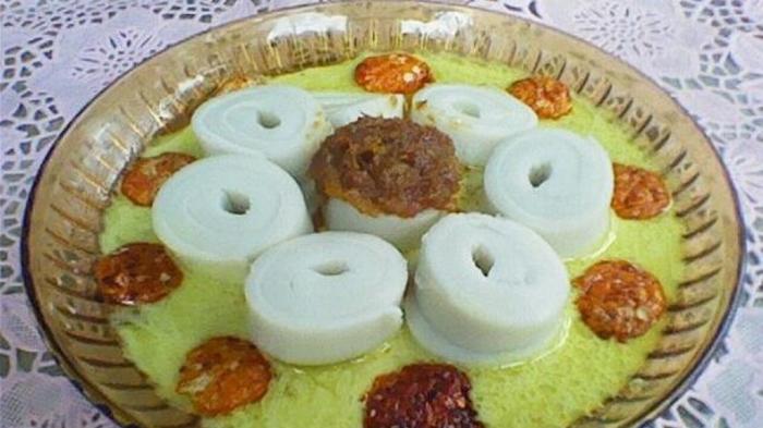 Masakan berkuah yang kerap disajikan pada saat pesta adat pernikahan ini adalah sejenis makanan berat berbahan dasar irisan ikan tenggiri, gabus atau belida.