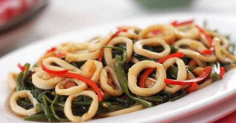 Sebagai daerah yang terletak di pesisir, tentunya Jambi juga memiliki makanan tradisional berbahan dasar hasil laut, salah satunya adalah cumi cah kangkung.