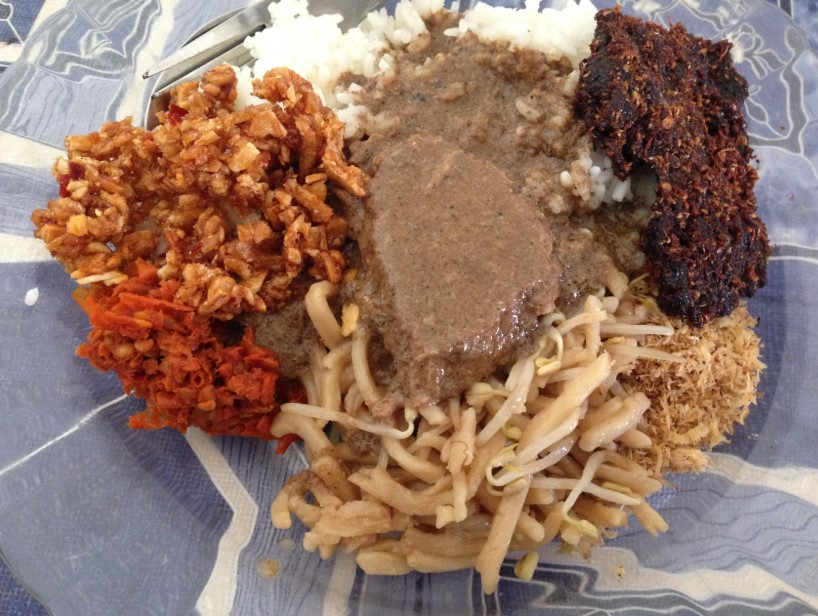 Untuk membuatnya cukup mudah, daging ayam dimasak dengan bumbu santan yang dilengkapi serbuk kelapa sangrai dan kemudian ditambah irisan kentang kukus serta kerupuk udang.