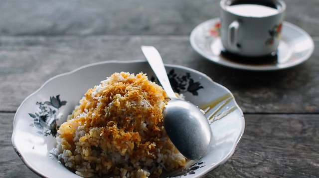Yang enaknya lagi, kuliner tersebut disajikan dengan taburan kratok atau kacang koro serta cairan gula merah. Sehingga tak hanya gurih tapi juga manis dan asin.
