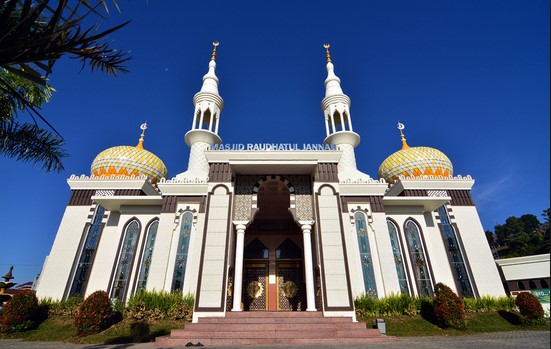 Selanjutnya, yaitu Masjid Raudhatul Jannah (MRJ). Berada tidak jauh dari Masjid An-Namira, surau ini juga tidak kalah megah.