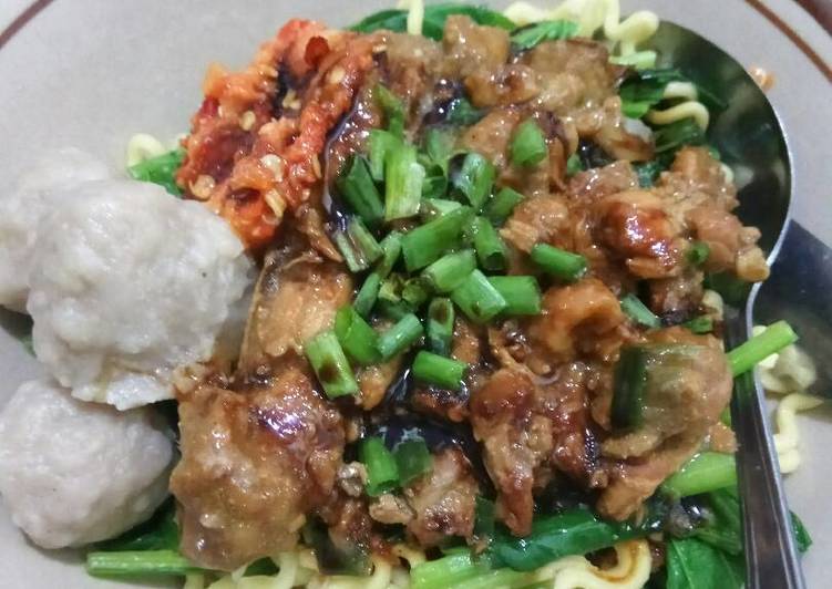 Kemudian diatasnya ditambah oleh pangsit goreng yang renyah serta ceker ayam yang lembut dan dilengkapi dengan kuah kaldu yang gurih.