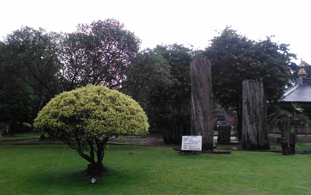 Latar depan museum berupa potongan batang-batang pohon tua serta patung-patung cantik yang bersumber dari kisah Ramayana juga mengisi sekeliling Gedung Museum Indonesia.
