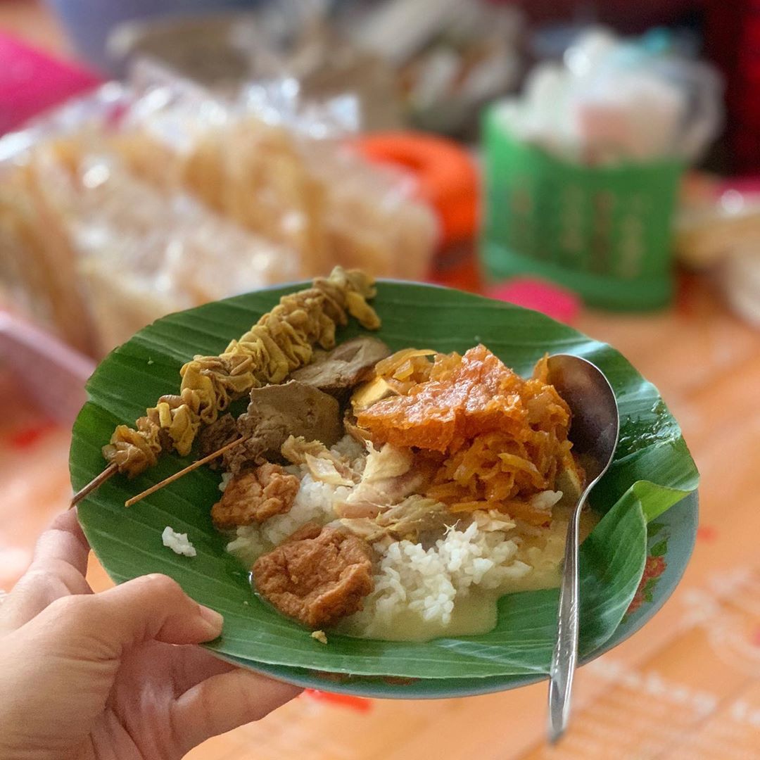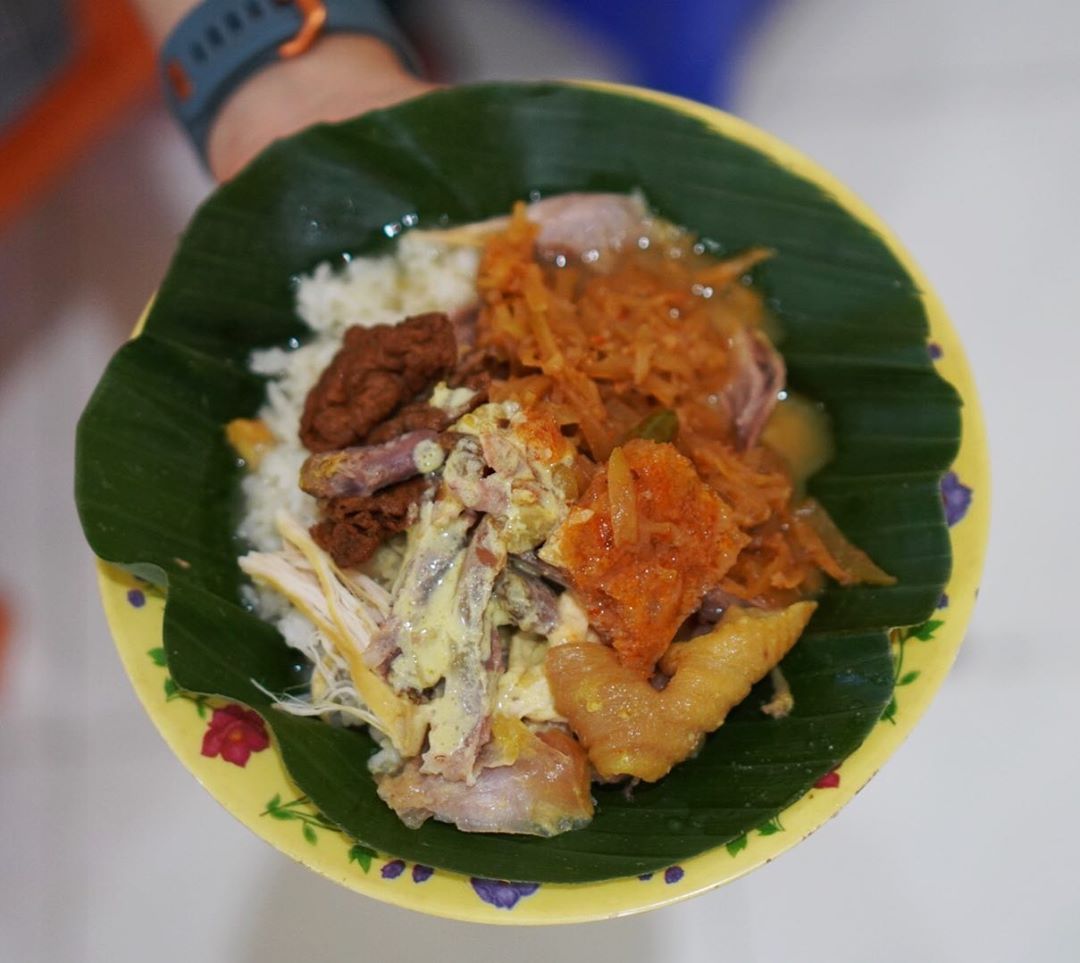 Perpaduan antara warna cokelat dan merah akan mewarnai sepincuk daun pisang Nasi Ayam Bu Pini yang telah kamu pesan. Satu porsinya cukup untuk mengisi perutmu saat pagi, siang ataupun malam hari.