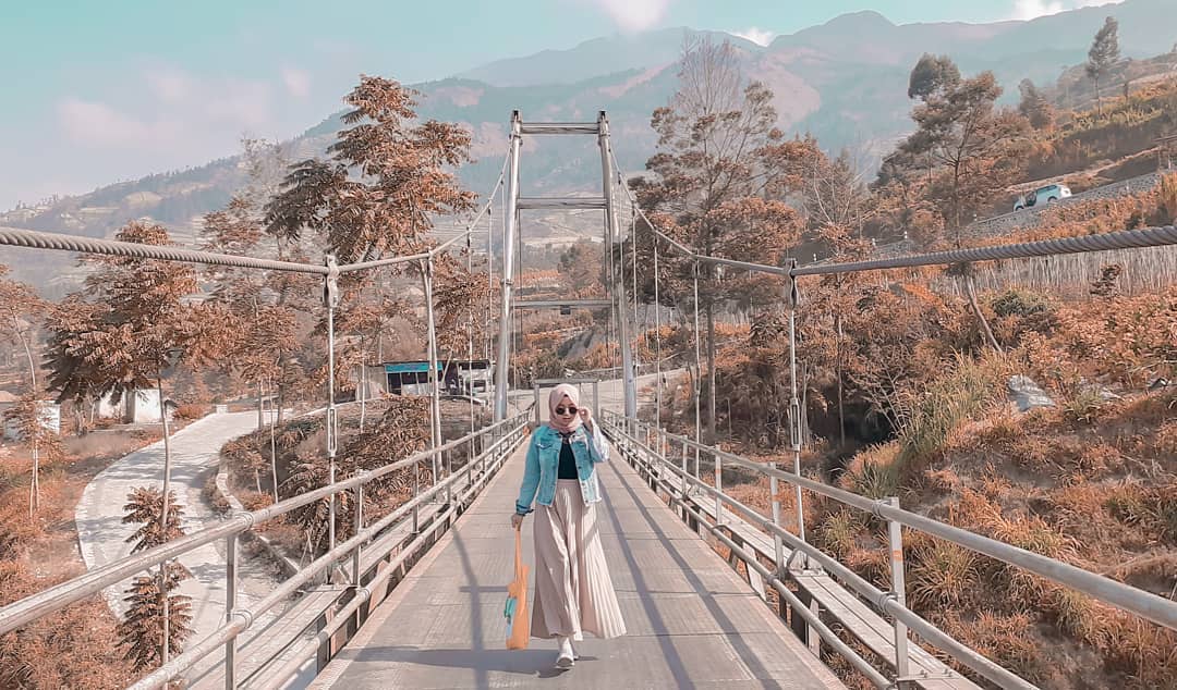 Pelancong dapat mengabadikan peristiwa-peristiwa penting mereka ketika berada di jembatan gantung Desa Jrakah Selo berlatar belakang lanskap Merapi yang begitu memikat.