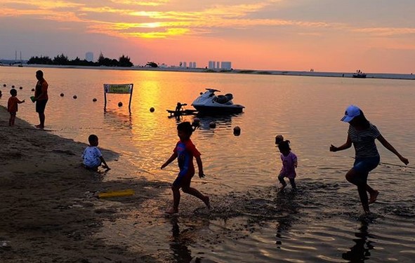 Di hari libur dan akhir pekan, sekitar pesisir pantai akan ramai oleh wisatawan yang berjemur sambil mengawasi anak-anak bermain di atas ban warna-warni yang ramai menghiasi bibir pantai.