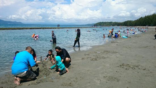 Memiliki perpaduan antara pepohonan rindang, pasir putih halus, kerikil-kerikil kecil dan air laut berwarna biru jernih serta perairannya juga sangat dangkal membuat area ini aman untuk berenang.