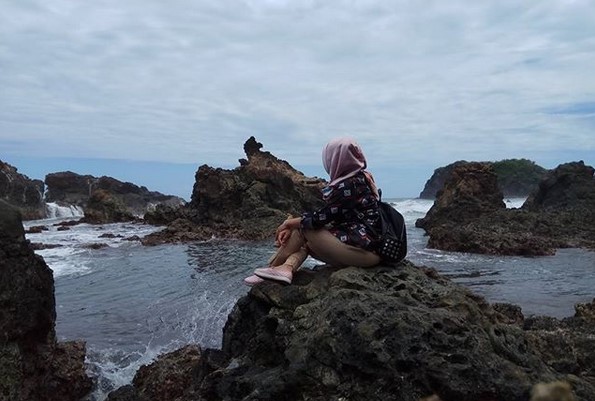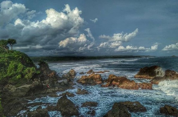 Jika pernah mengunjungi Tanah Lot di Tabanan, Bali, maka kurang lebih seperti itulah gambaran tempat indah ini. Ciri khas pantai ini adalah tebing-tebing yang menjorok ke laut, pasir pantai hitam justru menambah eksotis surga tersebumnyi ini.