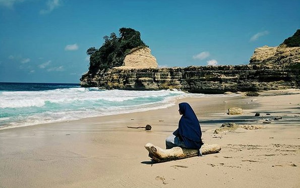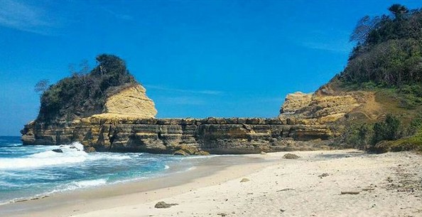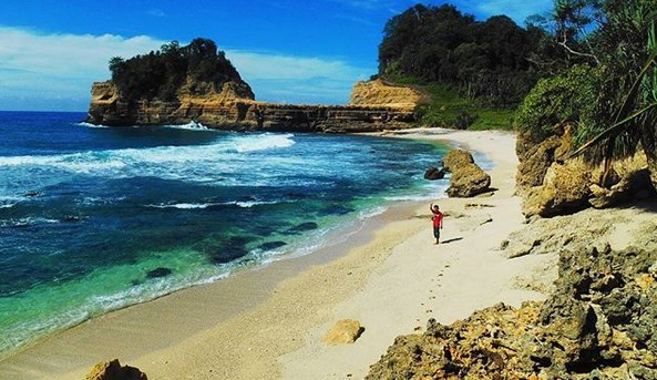 Pemandangan di tempat ini memang sungguh mengagumkan, dengan air lautnya yang berwarna biru, pasir putih yang lembut, serta batu karang di sisi kanan dan kirinya yang kokoh, menjadikan pantai ini memiliki ciri khas tersendiri dari yang lainnya.