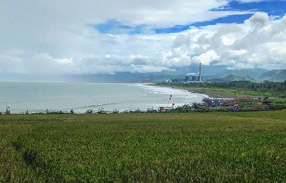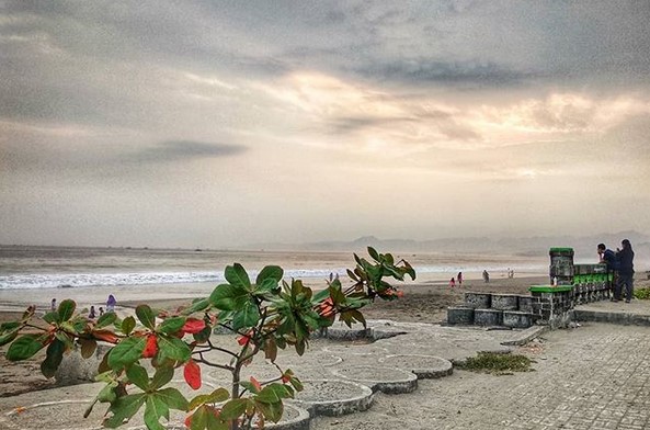 Batu-batu karang besar yang bertebaran memenuhi hampir semua sudut pantai yang berpadu dengan birunya air laut dan ombak yang tidak pernah berhenti bergulung serta berlatar belakang cerobong PLTU di kejauhan memberikan nuansa keindahan yang berbeda.