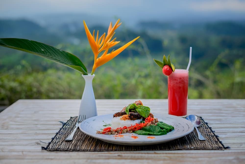 Tidak ketinggalan, di rumah makan ini wisatawan juga bisa menikmati santapan sambil melihat pemandangan Gunung Agung yg sangat cantik.