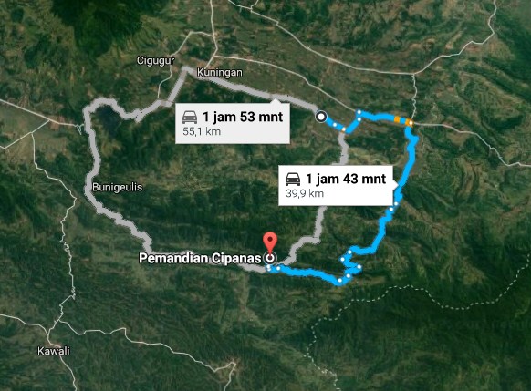 Dari Kuningan, Anda bisa melewati jalan menuju Kecamatan Kuningan. Setelah itu melewati Jalan Jenderal Soedirman dan Taman Kota.