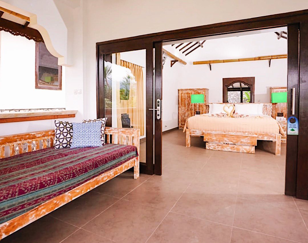 Berbeda dengan kamar sebelumnya, kamar ini dilengkapi tempat tidur king-size double bed dan sebuah single-bed. Triple Room bisa dipesan dengan kapasitas dua atau tiga orang. Jangan lupa untuk berleyeh-leyeh di teras di atas day-bed ya!