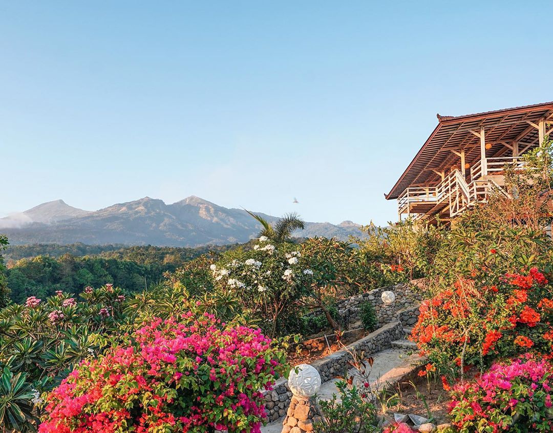 Penginapan ini menawarkan pemandangan Gunung Rinjani dan pematang sawah di kaki gunung yang bisa dilihat dari restoran bahkan kamar.