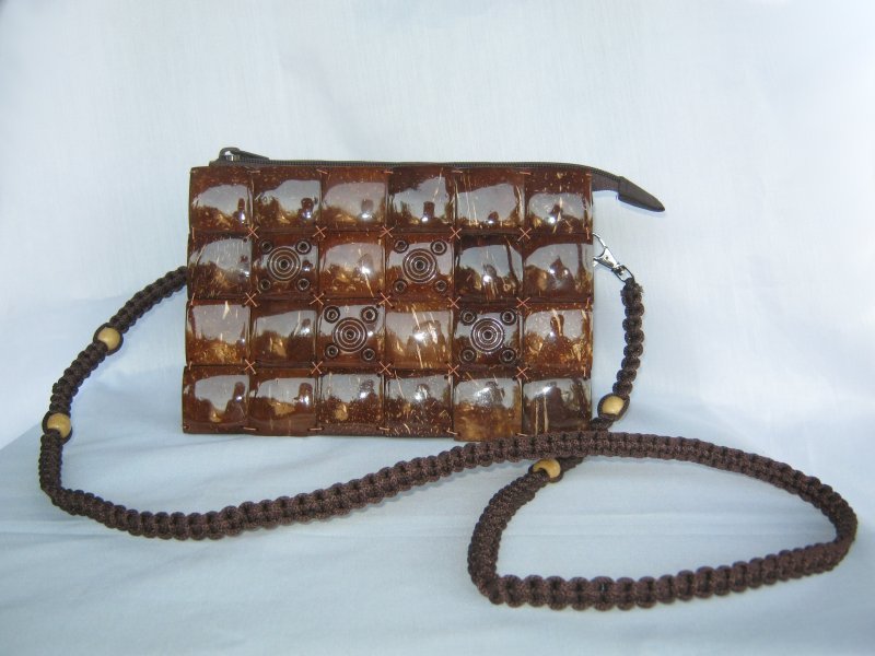 Selanjutnya ada kerajinan Batok Kelapa yang disulap menjadi sebuah benda fungsional unik dan menarik. Jika biasanya tas pada umumnya terbuat dari kulit, benang rajutan, ataupun kain.