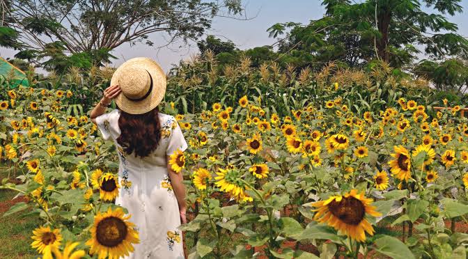 Tak perlu jauh-jauh ke Jogja atau Malang buat berburu spot sunflower karena tempat ini pas sekali buat yang ingin hunting foto instagramable dengan background bunga matahari.