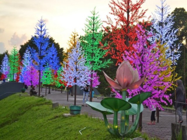Cahaya lampu yang selama ini lebih banyak difungsikan sebagai penerangan, di Taman Monjali diubah menjadi ornamen-ornamen cantik yang menghadirkan kesan unik dan menarik.
