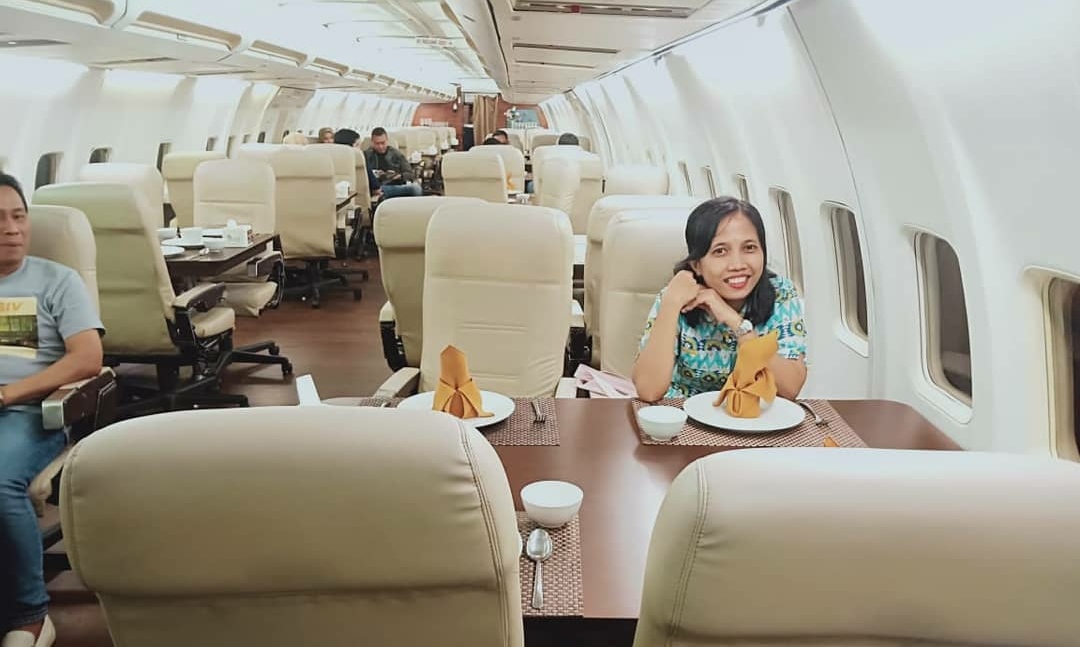 Ada yang berbeda dari restoran satu ini. Selain mengusung konsep dekorasi dengan perabotan kayu, ada pula tempat makannya yang menghadirkan suasana di dalam pesawat.