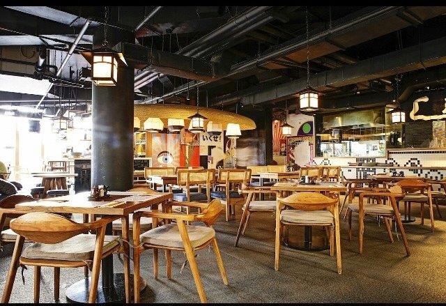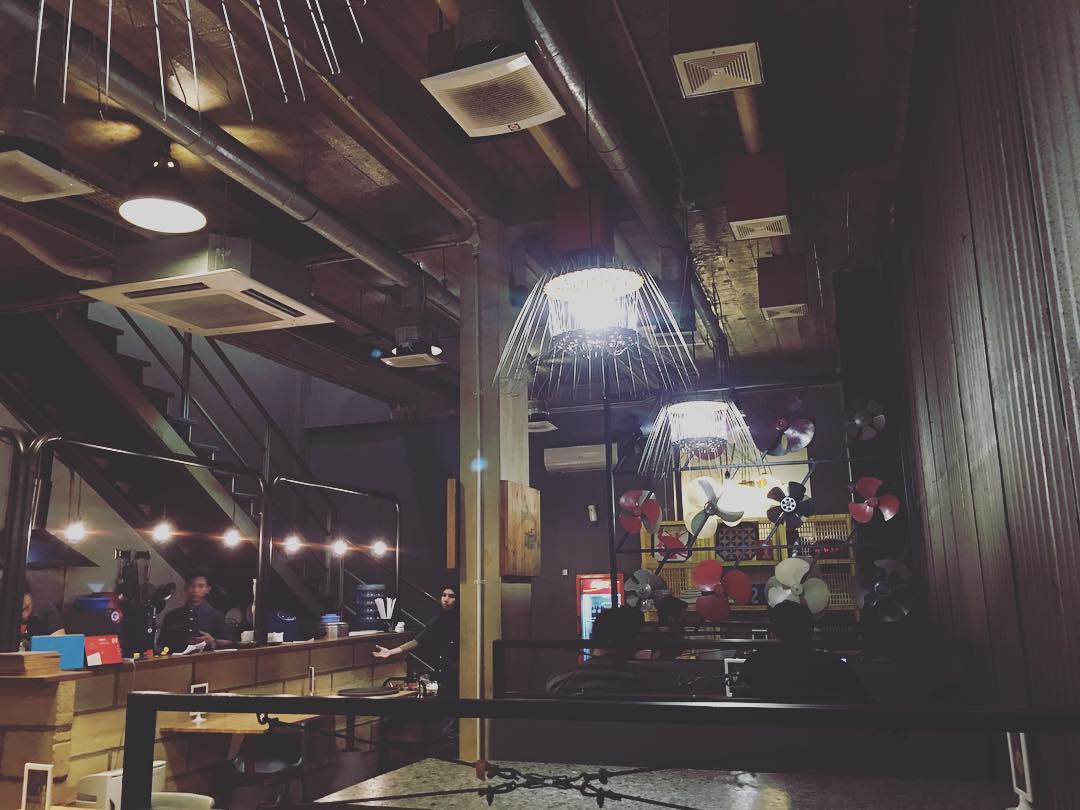 Dengan dekorasi industrial, Restoran ini furniture-nya dibuat dari bahan daur ulang seperti krat botol untuk tempat duduk.