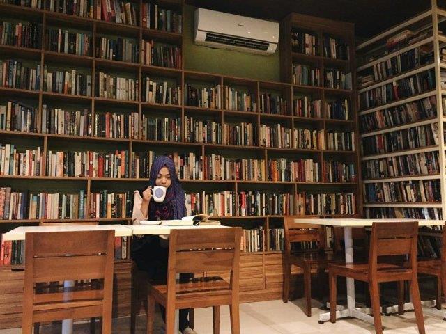 Tempat makan satu ini pasti jadi favorit pecinta buku dan orang yang hobi membaca karena mengusung konsep perpustakaan. Di dalamnya disediakan berbagai macam buku yang tertata dengan rapi di rak.