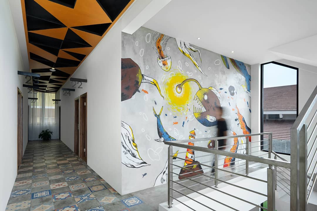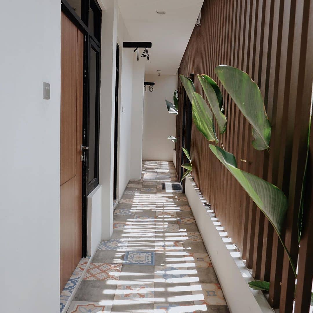 Desain penginapan ini memang dibuat estetik. Di beberapa spot tembok akomodasi ini terdapat lukisan yang membuat suasana semakin terlihat hidup. Beberapa spot dinding dilapisi semen yg membuatnya semakin estetik.