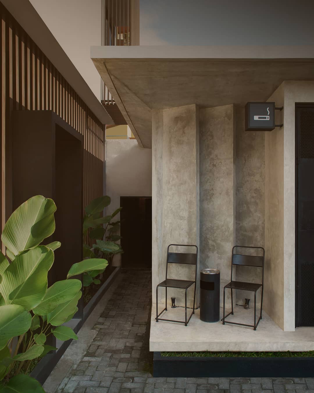 Dari luar, bangunan hotel ini saja sudah terlihat fotogenik. Bentuknya kotak dengan perpaduan elemen kayu serta cat putih dan hitam.