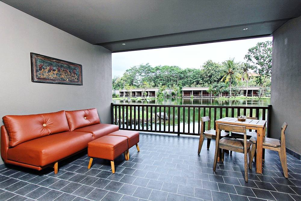Untuk tipe Suite, ada sofa dan meja di balkon yg bisa kamu gunakan untuk berkumpul bersama keluarga. Menariknya lagi, balkonnya langsung menghadap ke danau!