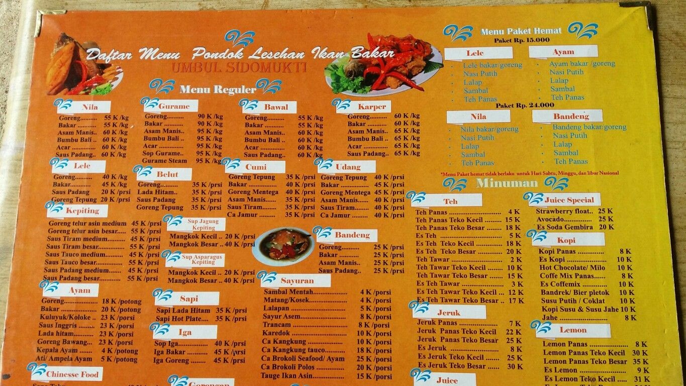 Karena berada di daerah pegunungan, rumah makan ini lebih banyak menyediakan menu ikan air tawar dan hanya ada tiga menu ikan laut yaitu udang dan cumi serta kepiting. Sedangkan menu ikan air tawar ada ikan gurame, bawal, nila, lele, belut dan bandeng.