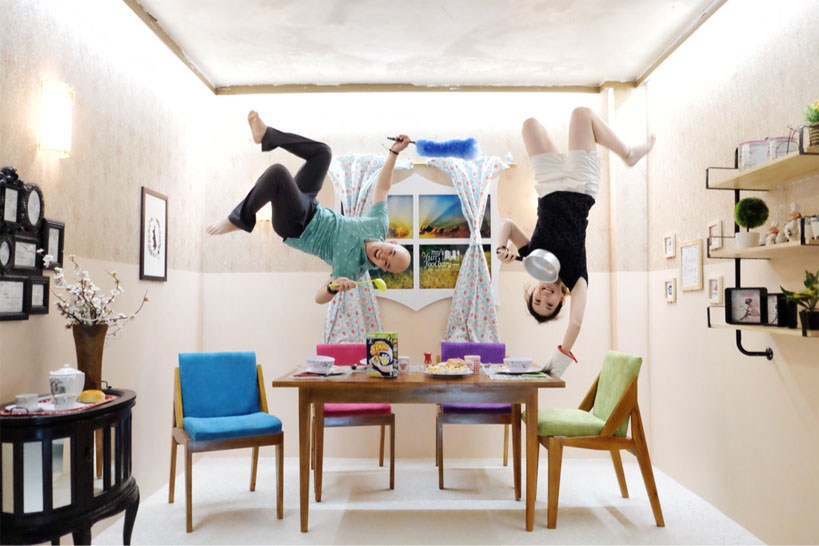 Di Upside Down World Jogja, ruangan untuk berfoto di desain melayang. Pengunjung dapat berfoto dengan normal, namun hasilnya akan terlihat sangat unik.