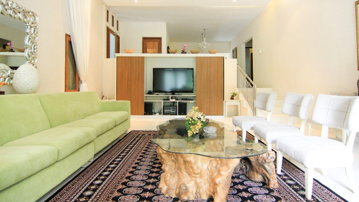 Ketika masuk ke dalam hunian ini, Anda akan menemukan ruang tamu yang dilengkapi dengan sofa besar dan karpet, cocok digunakan untuk kumpul bersama keluarga sambil menonton TV.