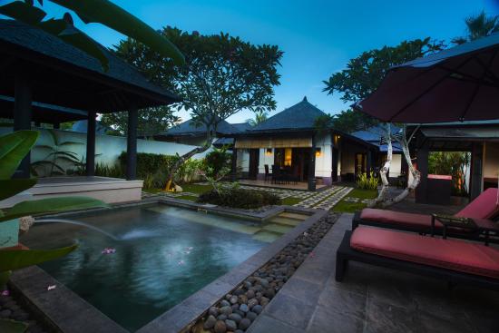 Fasilitas ruangan yang disediakan seperti 2 kamar tidur, ruang tamu, kamar mandi, dapur, pantai pribadi, kolam renang, minibar, ruang makan, furnitur dan alat elektronik lengkap, wifi, sarapan.