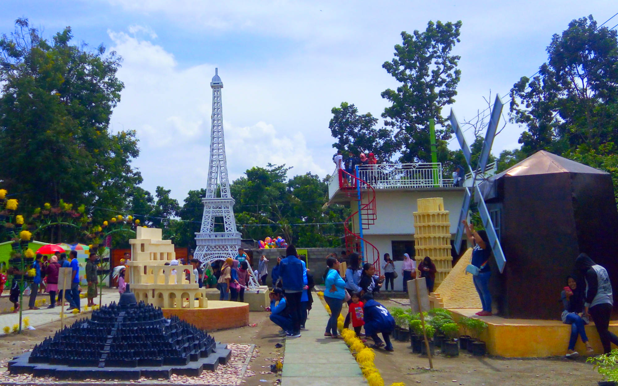 Karena disini ada puluhan miniatur landmark dunia seperti Menara Eifel, Menara Pisa, Candi Borobudur, Tugu Monas, Kincir Angin, Pyramida dan masih banyak wahana lainnya.