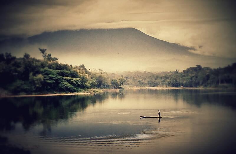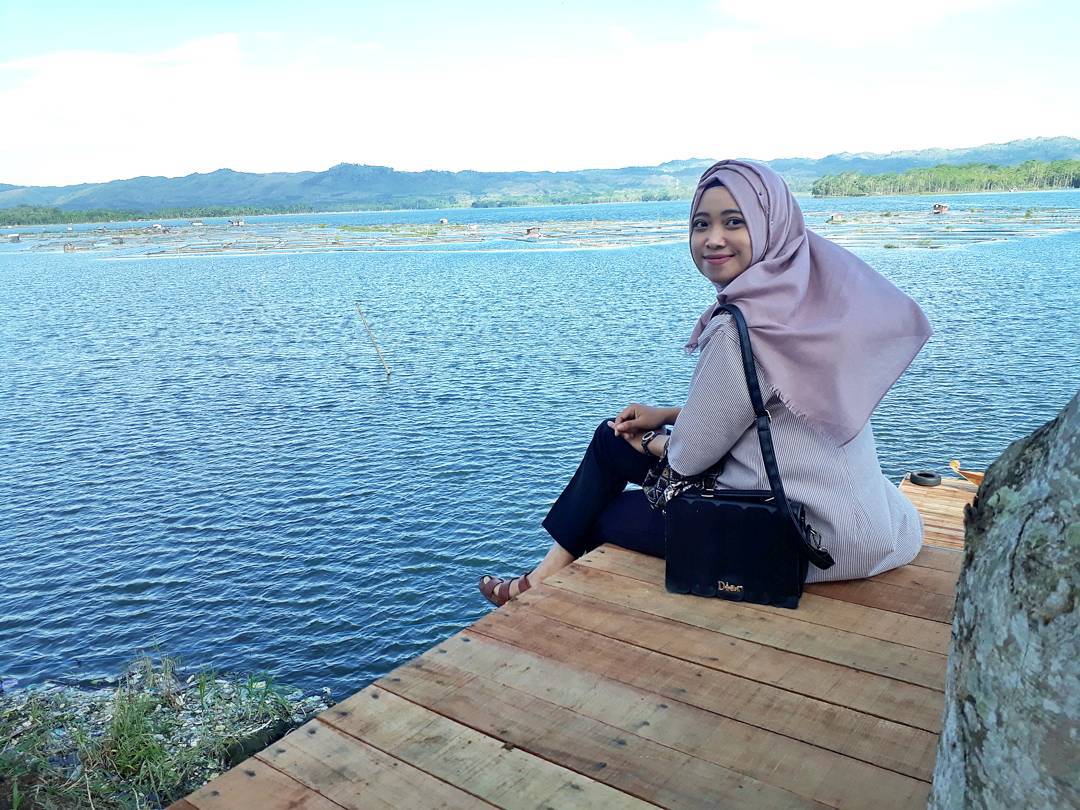 Panorama yang disuguhkan berupa hamparan kolam raksasa dikelilingi pepohonan rindang dan bebukitan.