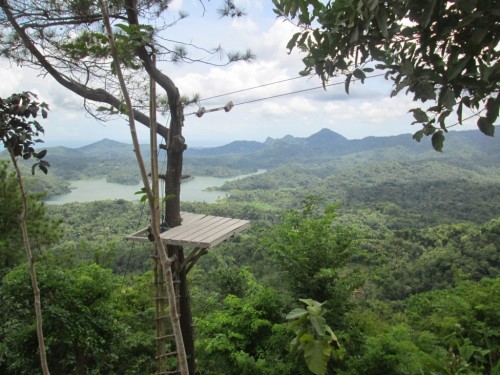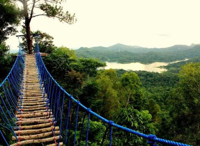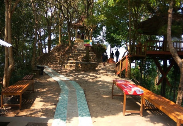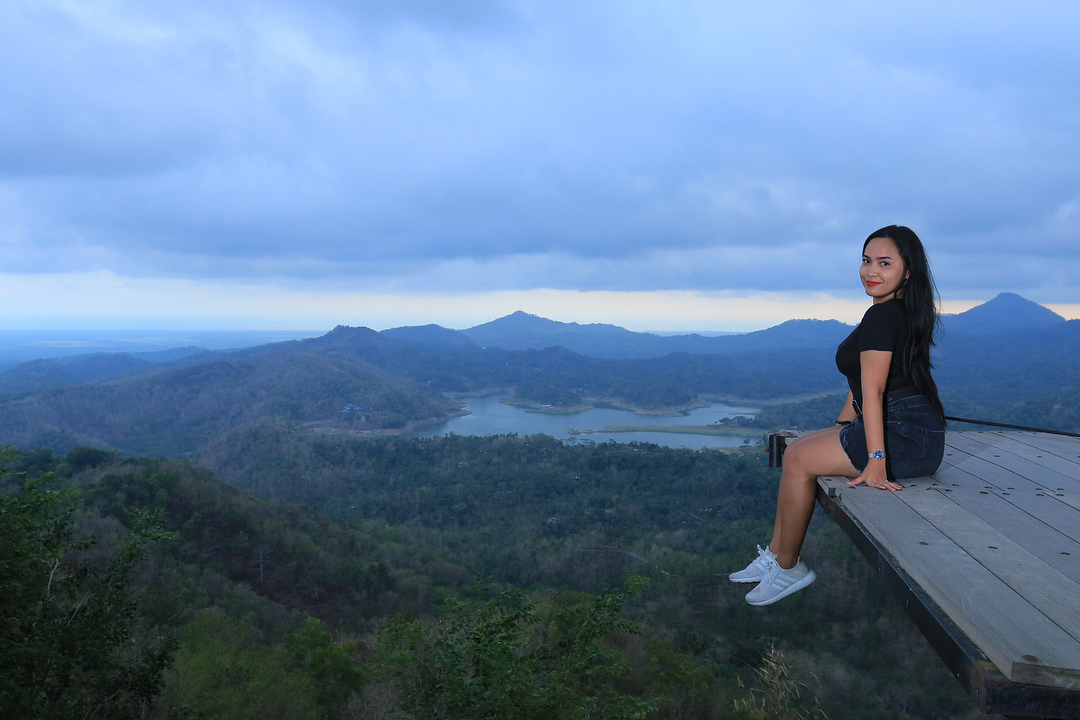 Setelah tenaga dirasa sudah pulih kembali, lanjutkan langkah hingga sampai ke puncak dan nikmati pesona keindahan alam yang disuguhkan Kalibiru lewat landskap berlatar belakang hamparan air berwarna kebiru-biruan di Bendungan Sermo serta Perbukitan Menoreh yang didominasi warna hijau pepohonan.